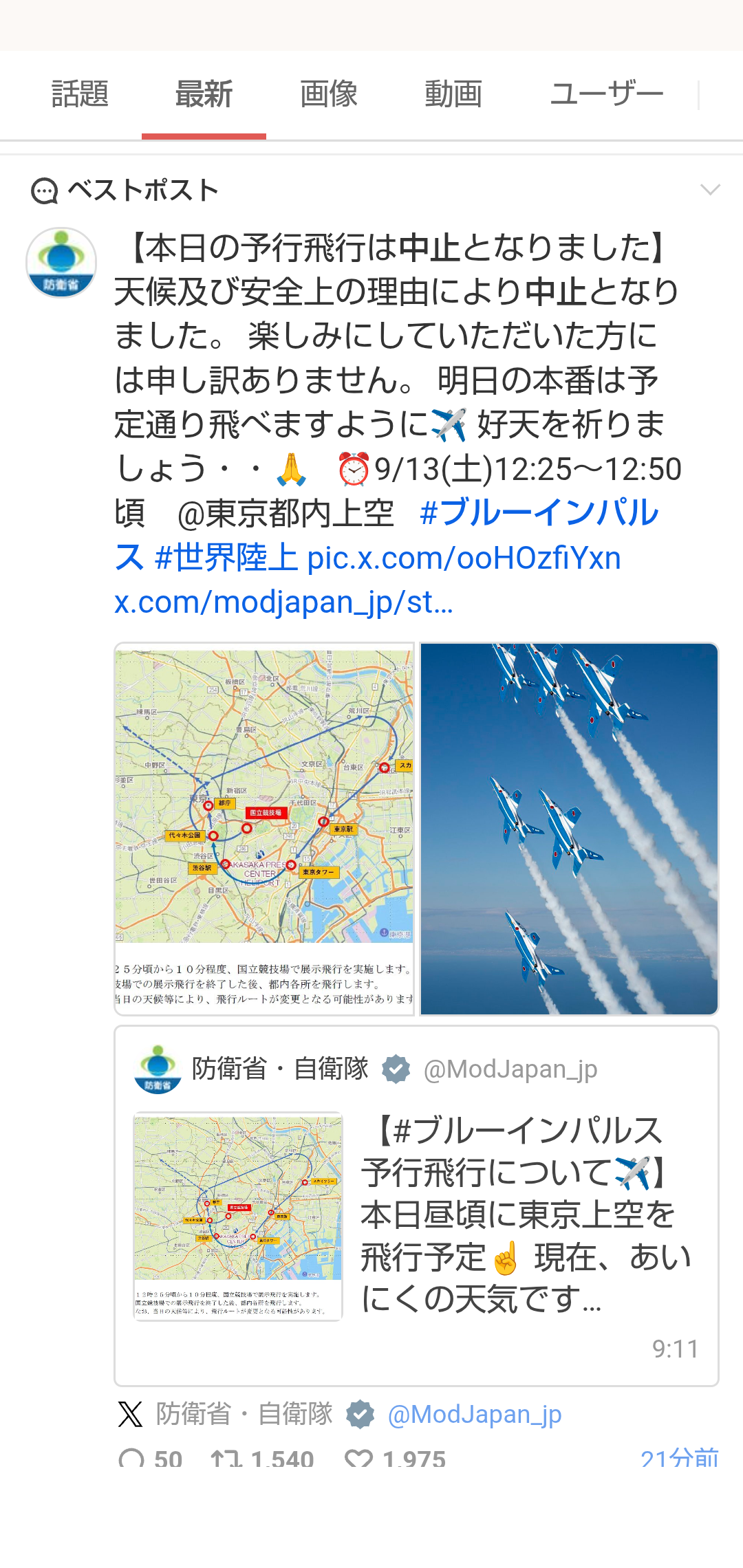 トップ > ポジティップ写真館 > MB-1グランプリ🏆 > MB-1グランプリセミファイナル大トリ記念の『ブルーインパルス展覧飛行』は、残念ながら中止となりました。😎 アジアの魂 2025/09/12 12:49 MB-1グランプリセミファイナル大トリ記念の『ブルーインパルス展覧飛行』は、残念ながら中止となりました。😎 📣MB-1グランプリセミファイナル大トリ記念📣 ブルーインパルス展覧飛行は、残念ながら中止となりました。😂 飛行ルートでは渋谷も通過する予定でした~。😂 明日はシッカリ飛んでね ブルーインパルスぶっつけ本番‼️ 飛行ルートでは渋谷も通過 いいね 共有する 共有する X facebook LINE リンクをコピー コメントする 0 件の返信 (新着順)
