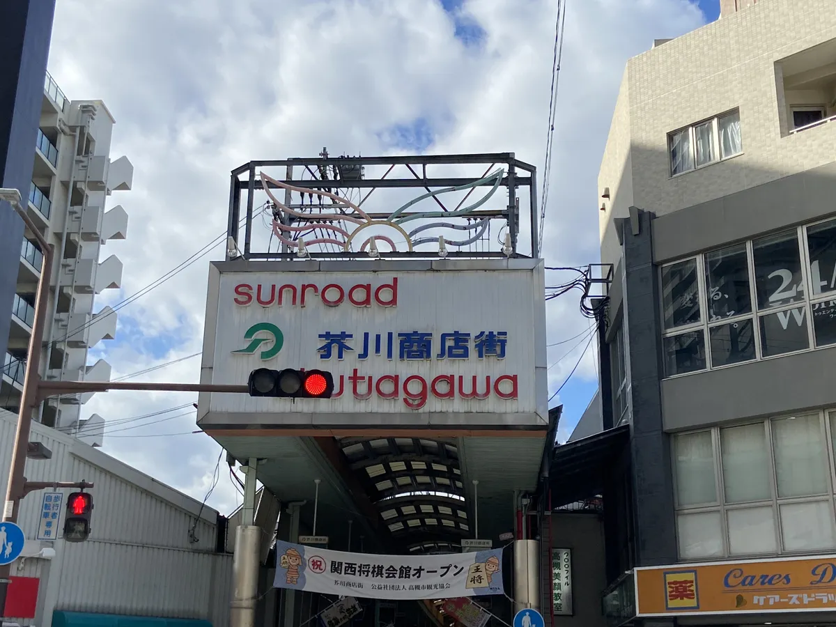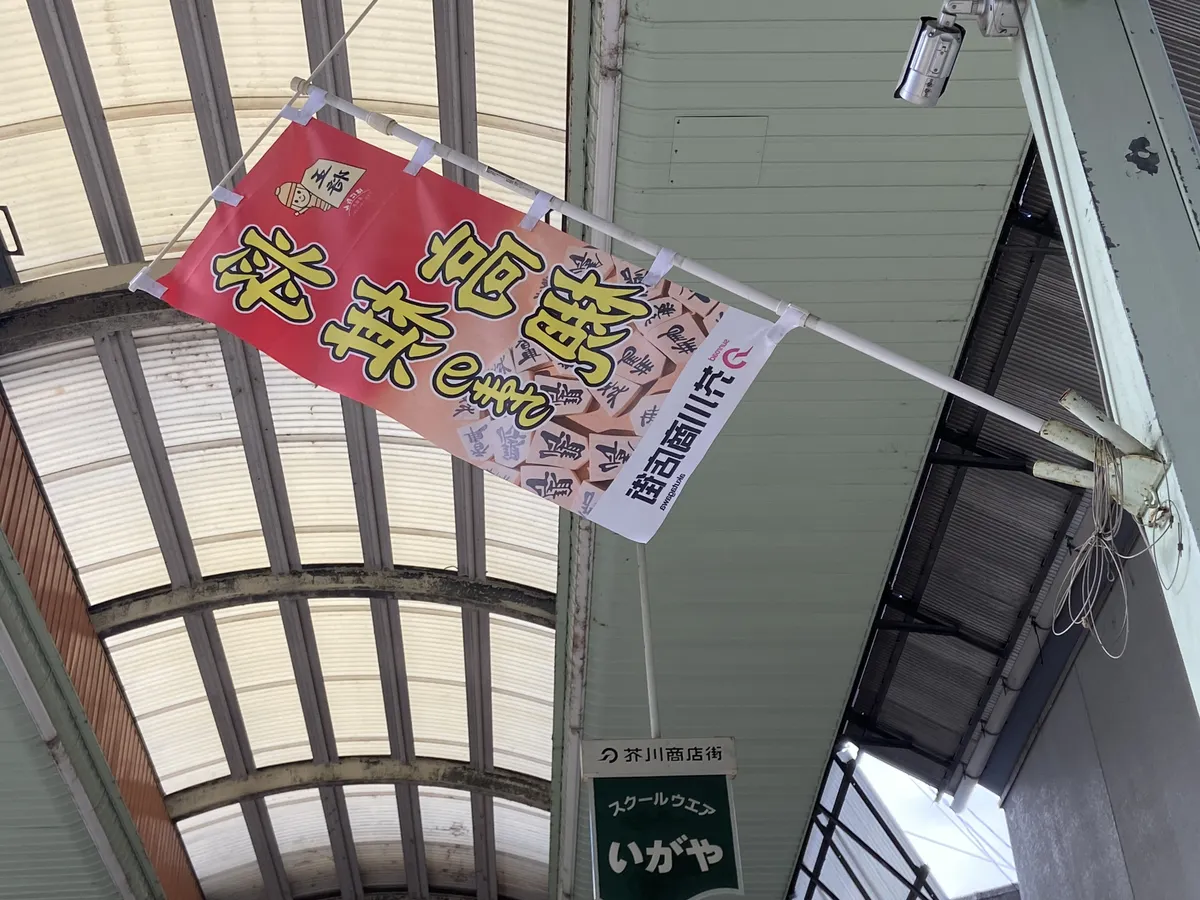 芥川商店街には関西将棋会館があり、「将棋のまち高槻」の旗が立っています。