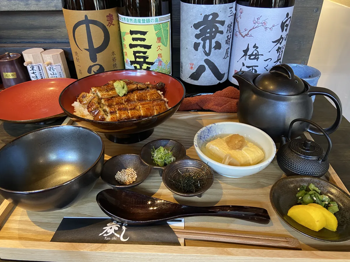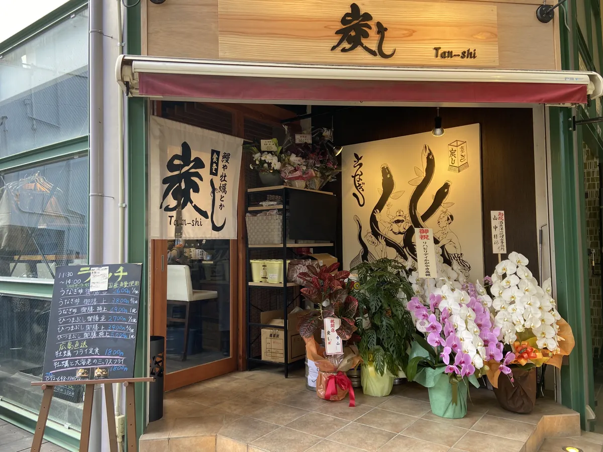 芥川商店街の中に最近オープンした「炭し(たんし)」という鰻と牡蠣のお店があってここで昼食を頂きました。