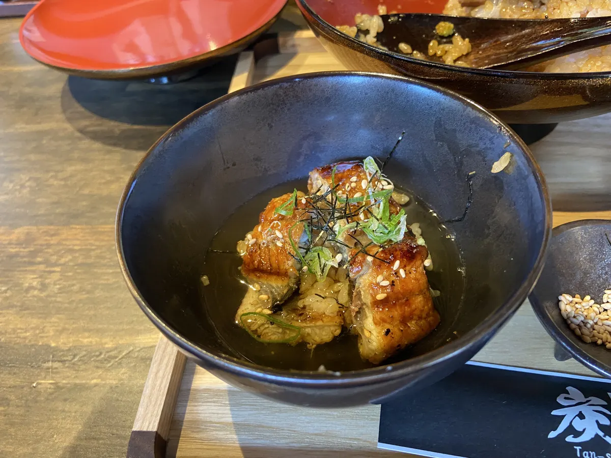 鰻は薬味をのせたり、出汁をかけてお茶漬けにして食べます。とても美味しかったです。