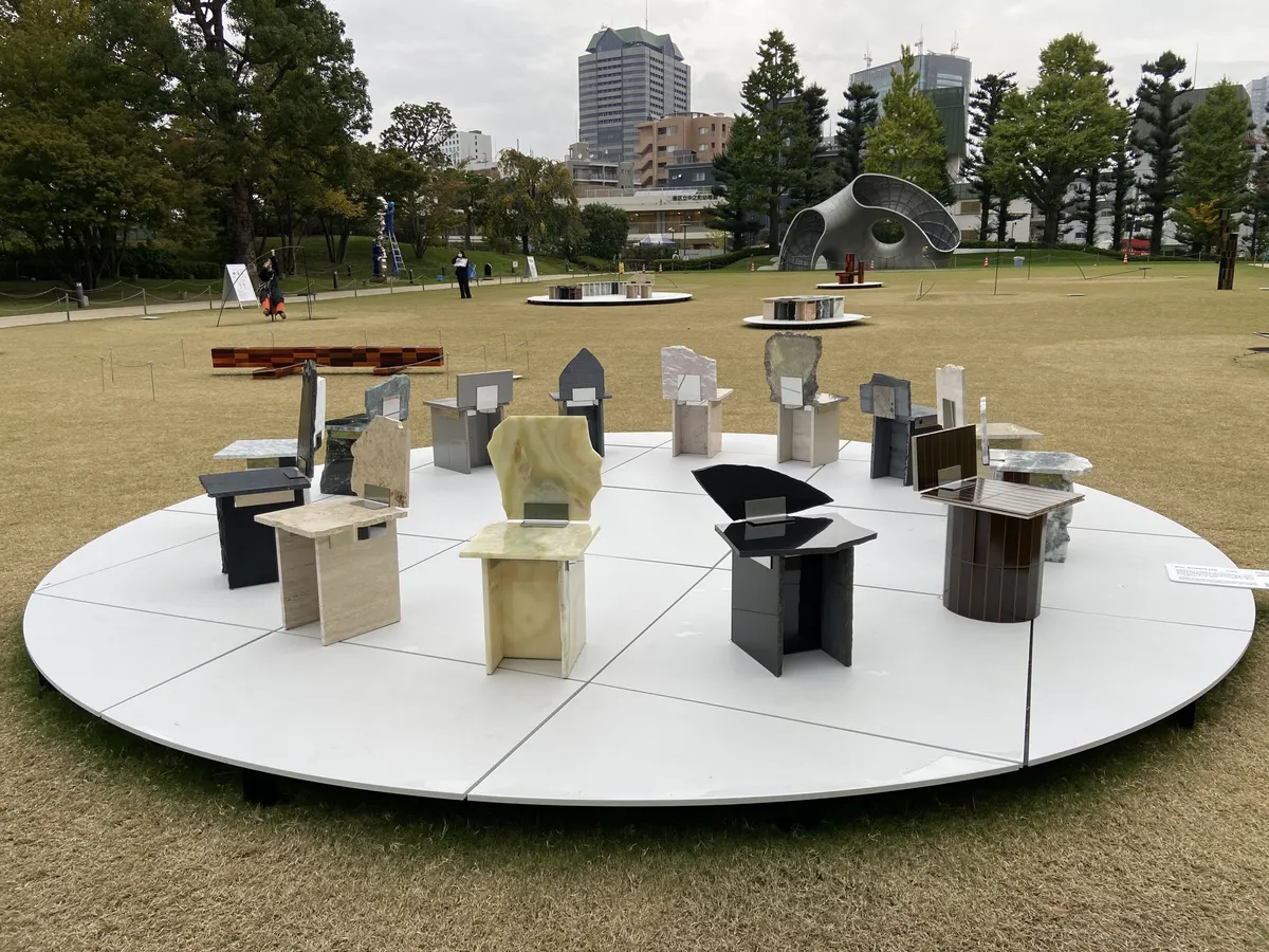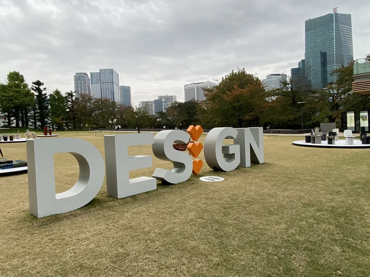 東京ミッドタウンの芝生広場。この日は現在開催されている「デザインライブ」の展示物が置いてありました。