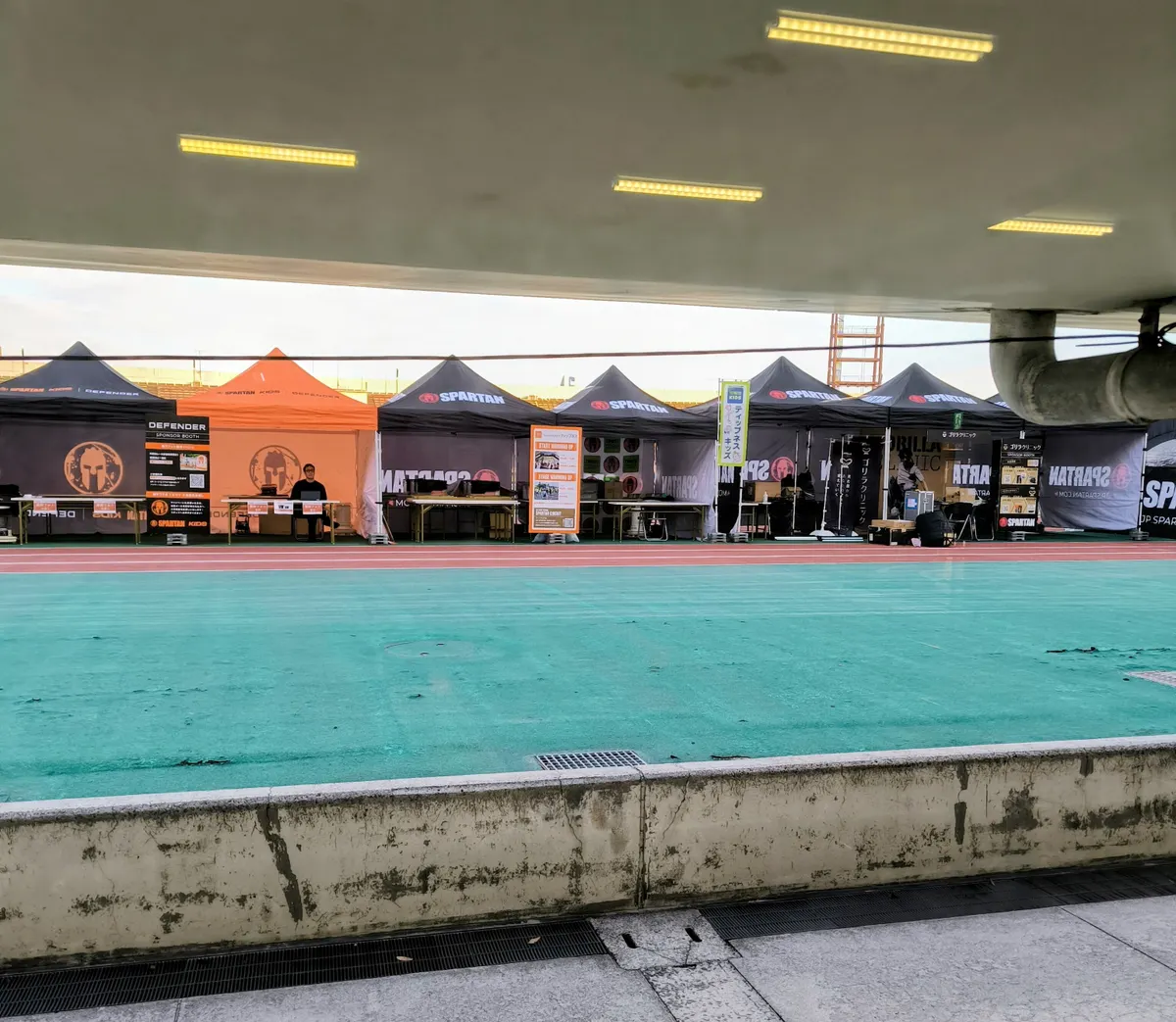 販売ブースなどが並ぶ競技場トラック内!