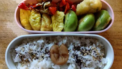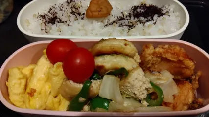 おはティッパー☀️ 1か月以上ブランクあるから…何から…作ろうか…手際悪い気がする…とりあえず初日はこんな、お弁当になりました🙄釣り人のせいで冷蔵庫に余裕なくて買い出ししてないから…あるもので作りました ☆キャベツと赤ピーマンの和風炒め☆玉子焼き☆梅しそとり天☆ほうれん草の餃子🟢🟢🟢
