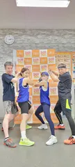 今日のむさふじティップ スタジオレッスン! 本日の日曜むさふじスタジオレッスンは、家内の買い物に付き合わされてpower45に間に合わず、fight45の1レッスンで終了しました… 物足りない😢 レッスン後の恒例の記念撮影は、あの寸足らずの背景前で撮りました!🤣ピタパンの三澤IRとTeamむさふじのメンバーで抜刀のポーズですが…、背