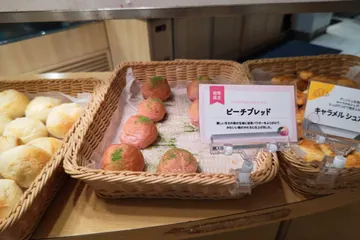 散歩後の晩ご飯はバケットで。今日から期間限定で 🍑ピーチブレッド🍑 提供開始しました✨ ピーチ🍑風味と抹茶パウダーのトッピングで甘さを少し控えめにして食べやすい味に。 他にも… キャラメルばななパン🍞🍌 そして…オレンジフロマージュ