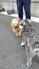 もじゃもじゃ同士🐶🐶 今日2度目のお散歩🐾久しぶりにバニー👯ちゃんに会えました💗ごまちゃんとバニーは仲良し🐶🐶 バニーのお家はみんなヨーキ一 いちご🍓メロン🍈バニー👯本当はパイン🍍にしようと思ったんだけど… なぜかバニー👯にしちゃったらしい…パイン🍍が良かったよね? バニーまたね👋