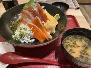 魚、さかな、サカナ〜🐟丼‼️ 今日はココ‼️ 前回来た時は日曜日だったので人で溢れていましたが、平日夜だと落ち着いていますね。 まずは夕食。イオンモール内にある「築地 飛賀屋」に入りました。 海鮮丼が名物の和食屋さんの様です。 今日頂いたのはこちらの三色漬け丼。しらすも付いててお得🉐とって