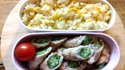 炒飯弁当 おかずオクラの肉巻き一品料理スタイル 開けてびっくりしたかなぁ…たまにはいいよね頑張らなくても🤣